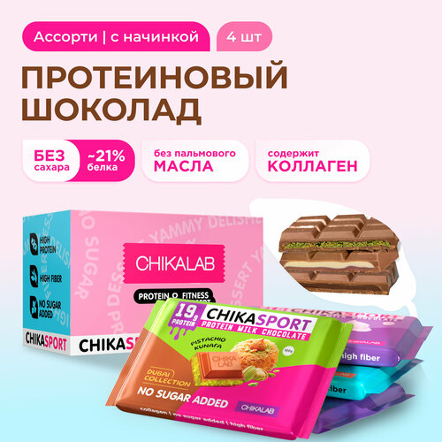 CHIKALAB Протеиновый шоколад без сахара с начинкой Ассорти Микс , 4шт х 100г