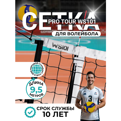 Сетка профессиональная для волейбола кромка текстиль 9.5м, 100*100мм + карманы + антенны + сумка WS101 Pro Tour KV.REZAC rus