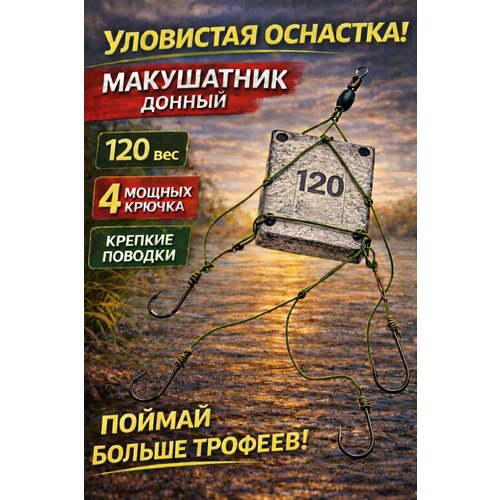 Донная оснастка макушатник 120 г, снасть для карпа, 4 карповых крючка №2, поводок 35 lb