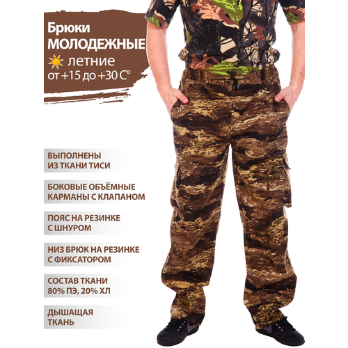 Брюки мужские камуфляжные летние для охоты и рыбалки, для туризма, для походов в лес, для работы, для дома и дачи. Ткань - ТиСи состоит 80% из полиэфирных волокон и 20% из хлопковых нитей. Натуральный материал обеспечивает прекрасные гигиенические показатели, а синтетическая составляющая гарантирует высокий уровень износостойкости, долговечность и защиту от факторов окружающей среды. Брюки прямого силуэта с притачным поясом на резинке, с утягивающим шнуром. Брюки с 2-мя боковыми карманами и 2 - мя объемными накладными карманами, закрывающимися клапаном на липучках. Брюки можно использовать для туризма, походов, прогулок, охоты, рыбалки, пейнтбола, как спецодежду, брюки рабочие мужские, брюки для охоты и рыбалки, брюки для леса, рабочие брюки спецодежда, брюки для леса мужские, для дачи, как спецодежда, страйкбол, пейнтбол, милитари военные игры, прогулок, активный отдых, камуфлированная одежда, рыбацкий, повседневный, работа на стройке, рыбацкий, камуфлированый, тактический.