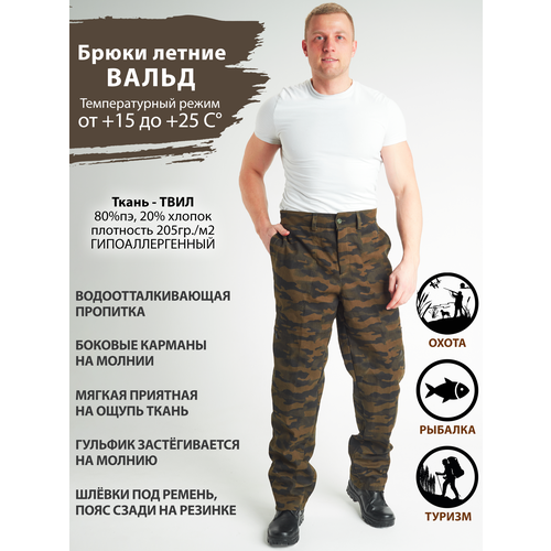 Брюки мужские камуфляжные летние из прочной премиальной и приятной к телу ткани твил (20%хлопок, 80%полиэстер, плотностью 205гр./м2) для охоты и рыбалки, для туризма, для походов в лес, для работы, для дома и дачи. Брюки прямые свободного кроя на притачном поясе с эластичной резинкой сзади. На поясе имеются шлевки для широкого ремня. Изделие выполнено из прочной современной ткани с водоотталкивающей пропиткой, которая не дает усадку и не теряет цвет после многочисленной стирки. Брюки оснащены двумя карманами с отрезным бочком и двумя прорезными карманами на молнии по бокам на уровне колен. Гульфик застегивается на молнию. Брюки можно использовать для туристических походов, походов в лес за грибами, прогулок на природе или в парке с питомцем, для охоты и рыбалки, а также для пейнтбола и активного отдыха. Можно в них ходить на работу или на дачу в огороде работать. А также наши премиальные брюки могут послужить отличным подарком для мужчины, мужа, парня, для отца и брата на день рождения, на 23 февраля.