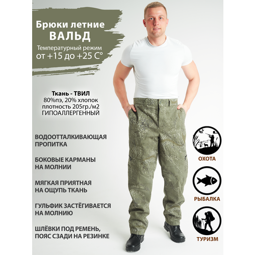 Брюки мужские камуфляжные летние из прочной премиальной и приятной к телу ткани твил (20%хлопок, 80%полиэстер, плотностью 205гр./м2) для охоты и рыбалки, для туризма, для походов в лес, для работы, для дома и дачи. Брюки прямые свободного кроя на притачном поясе с эластичной резинкой сзади. На поясе имеются шлевки для широкого ремня. Изделие выполнено из прочной современной ткани с водоотталкивающей пропиткой, которая не дает усадку и не теряет цвет после многочисленной стирки. Брюки оснащены двумя карманами с отрезным бочком и двумя прорезными карманами на молнии по бокам на уровне колен. Гульфик застегивается на молнию. Брюки можно использовать для туристических походов, походов в лес за грибами, прогулок на природе или в парке с питомцем, для охоты и рыбалки, а также для пейнтбола и активного отдыха. Можно в них ходить на работу или на дачу в огороде работать. А также наши премиальные брюки могут послужить отличным подарком для мужчины, мужа, парня, для отца и брата на день рождения, на 23 февраля.