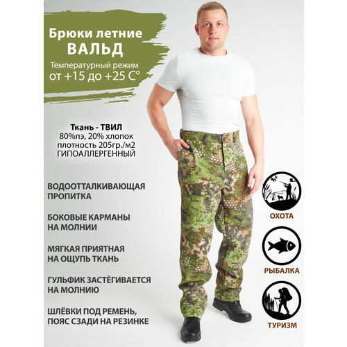 Брюки мужские камуфляжные летние из прочной премиальной и приятной к телу ткани твил (20%хлопок, 80%полиэстер, плотностью 205гр./м2) для охоты и рыбалки, для туризма, для походов в лес, для работы, для дома и дачи. Брюки прямые свободного кроя на притачном поясе с эластичной резинкой сзади. На поясе имеются шлевки для широкого ремня. Изделие выполнено из прочной современной ткани с водоотталкивающей пропиткой, которая не дает усадку и не теряет цвет после многочисленной стирки. Брюки оснащены двумя карманами с отрезным бочком и двумя прорезными карманами на молнии по бокам на уровне колен. Гульфик застегивается на молнию. Брюки можно использовать для туристических походов, походов в лес за грибами, прогулок на природе или в парке с питомцем, для охоты и рыбалки, а также для пейнтбола и активного отдыха. Можно в них ходить на работу или на дачу в огороде работать. А также наши премиальные брюки могут послужить отличным подарком для мужчины, мужа, парня, для отца и брата на день рождения, на 23 февраля.