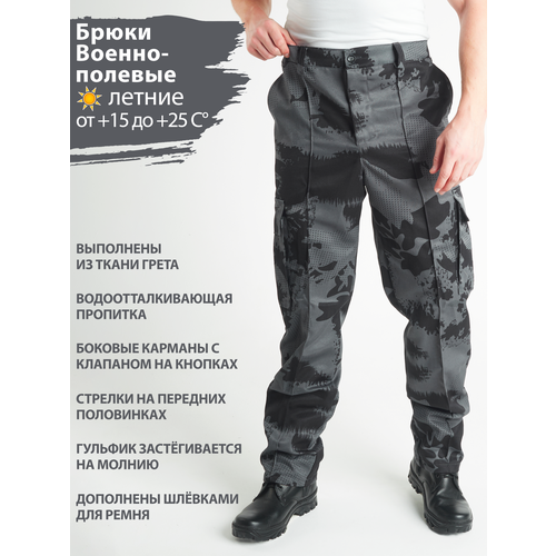 Брюки мужские военно-полевые камуфляжные летние для охоты и рыбалки, для активного отдыха на природе, для работы, для дома и дачи. Ткань - грета (80% полиэстер, 2% хлопок). Брюки прямые на притачном поясе, на спинке собраны эластичной резинкой. На поясе имеются шлевки для ремня. Брюки оснащены двумя карманами по бокам и двумя фигурными карманами с клапанами на липучках. Гульфик застегивается на молнию. Брюки можно использовать для туристических походов или для прогулок на природе, для охоты и рыбалки, для веселого пейнтбола или как спецодежду.