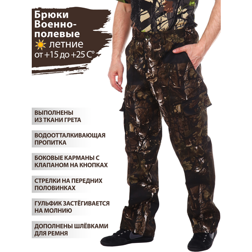 Брюки мужские военно-полевые камуфляжные летние для охоты и рыбалки, для активного отдыха на природе, для работы, для дома и дачи. Ткань - грета (80% полиэстер, 2% хлопок). Брюки прямые на притачном поясе, на спинке собраны эластичной резинкой. На поясе имеются шлевки для ремня. Брюки оснащены двумя карманами по бокам и двумя фигурными карманами с клапанами на липучках. Гульфик застегивается на молнию. Брюки можно использовать для туристических походов или для прогулок на природе, для охоты и рыбалки, для веселого пейнтбола или как спецодежду.
