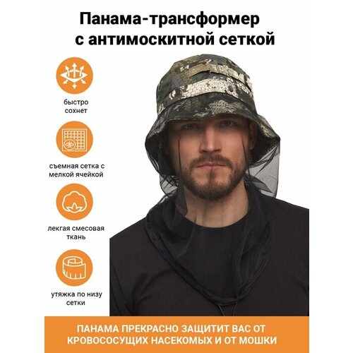 KATRAN кайман – это панама с атимоскитной сеткой. В качестве основанного материла используется высококлассный хлопок, который превосходно дышит и не прокусывается комарами. Антимоскитная сетка имеет достаточно мелкую ячейку, чтобы защитить вас от любого насекомого, плюс к этому сетка имеет утяжку в районе горла. Сетка несъёмная и, если она вам не нужна, можно убрать её в специальный карман, который находится над полями. Также на кепке расположены два миниатюрных кармана и четыре петли, в которые можно вставлять ветки для дополнительной маскировки охотника.