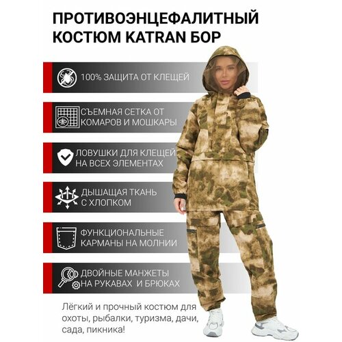 Женский костюм противоэнцефалитный антимоскитный KATRAN Бор. Антимоскитная сетка на молнии. Ловушки для клещей на всех элементах (рукава, туловище, брюки). Ткань: Твил (35% хлопок; 65% полиэстер). Капюшон с регулировкой объёма. Удлиненная молния на груди (в отличие от аналогов). Увеличенное количество карманов 6 шт (в отличие от аналогов). Куртка 2 нижних кармана на молнии (соединены в один большой карман). Рукав с двойной манжетой (трикотажная + резинка). Регулировка утяжки по низу куртки. Брюки с резинкой по талии и шлевками под ремень. Брюки 4 кармана на молнии. Двойные манжеты по низу штанов ((резинка + гетры в обувь).