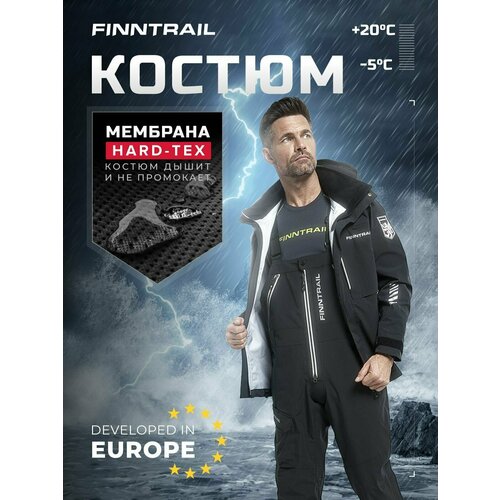 Костюм разработан для рыбалки с катера и лодки в плохую погоду. Прочный и лёгкий 4х слойный материал с мембраной Hard-Tex и водоотталкивающей пропиткой DWR обеспечивает защиту от ветра и осадков. Показатель водонепроницаемости составляет 20 000 мм, а дышащей способности – 7 000 гр./м 24 ч. Проклеенные швы надёжно защищают костюм от протечек.