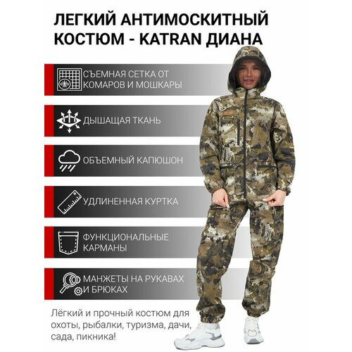 Легкий и прочный антимоскитный костюм KATRAN диана ткань Рип-стоп. Съемная антимоскитная сетка на капюшоне. Удлиненная куртка с утяжкой по талии. Легкая прочная износостойкая ткань Рип Стоп. Состав ткани 80% полиэстер, 20% хлопок. Прекрасно дышит, не пропускает солнечных лучей. Функциональные карманы, общее количество 7 шт. Удлинённая куртка свободного кроя. Утяжка по талии куртки с фиксаторами. Два боковых кармана на молнии. Один карман на груди на молнии. Объемный капюшон с антимоскитной сеткой. Регулировка объема капюшона сверху. Рукава с манжетами-резинками. Отстегивающаяся антимоскитная сетка. Тракторная молния с легким ходом.Брюки - Свободный крой. Два верхних кармана. Два боковых кармана на молнии. Резинка по низу брюк. Широкая поясная резинка. Шлевки под ремень.