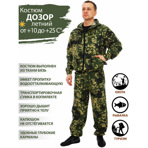 Костюм мужской летний легкий камуфляжный для охоты и рыбалки, а также для актвиного отдыха, для туризма и похода в лес. Изготовлен костюм из ткани Бязь. Ткань отлично дышит, испарения тела хорошо впитывает и очень приятна к телу. Куртка прямого силуэта, укороченная, с центральной застежкой - молнией, с поясом на резинке. Капюшон втачан в горловину, не отстегивается. Спинка с отрезной кокеткой, полочки цельнокроенные. Боковые накладные карманы втачаны в боковой шов. Рукава втачные двухшовные, с манжетами на резинке. Низ куртки с притачным поясам на резинке. Брюки свободного покроя с притачным поясом на резинке, с 2-мя боковыми накладными карманами. Для охоты, рыбалки, туризма, для дачи, как спецодежда, страйкбол, пейнтбол, милитари военные игры, прогулок, активный отдых, камуфлированная одежда, рыбацкий, повседневный, работа на стройке, одежда для охраны, спортивный, рыболовный, спец одежда мужская рабочая, для леса, за грибами, военный, для мужчин, женщин, подростков