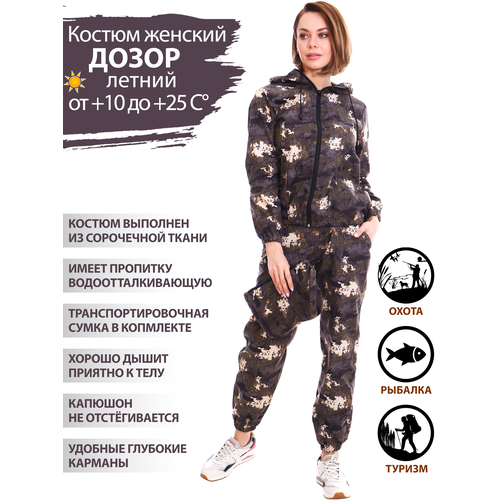 Костюм женский легкий летний камуфляжный для охоты и рыбалки, а также для актвиного отдыха, для туризма и похода в лес. Куртка прямого силуэта, укороченная, с центральной застежкой - молнией, с поясом на резинке. Капюшон не отстегивается. Спинка с отрезной кокеткой, полочки цельнокроенные. Боковые накладные карманы втачаны в боковой шов. Рукава втачные двухшовные, с манжетами на резинке. Низ куртки с притачным поясам на резинке. Брюки свободного покроя с притачным поясом на резинке, с 2-мя боковыми накладными карманами. Вниз брюк вставлена резинка. Костюм рыболовный женский прекрасно подойдет для охоты и рыбалки, для туризма и для дачи, можно носить просто как спецодежду, подойдет для страйкбол и пейнтбол, для военных игр, для прогулок на природе или активного отдыха, костюм можно носить как рыбацкий или повседневный, на работу на стройке, для леса за грибами.
