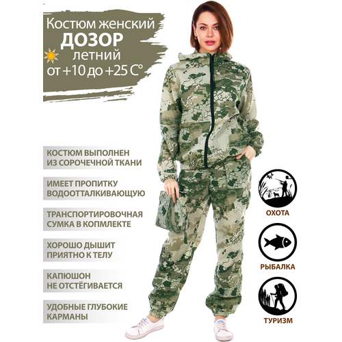 Костюм женский легкий летний камуфляжный для охоты и рыбалки, а также для актвиного отдыха, для туризма и похода в лес. Куртка прямого силуэта, укороченная, с центральной застежкой - молнией, с поясом на резинке. Капюшон не отстегивается. Спинка с отрезной кокеткой, полочки цельнокроенные. Боковые накладные карманы втачаны в боковой шов. Рукава втачные двухшовные, с манжетами на резинке. Низ куртки с притачным поясам на резинке. Брюки свободного покроя с притачным поясом на резинке, с 2-мя боковыми накладными карманами. Вниз брюк вставлена резинка. Костюм рыболовный женский прекрасно подойдет для охоты и рыбалки, для туризма и для дачи, можно носить просто как спецодежду, подойдет для страйкбол и пейнтбол, для военных игр, для прогулок на природе или активного отдыха, костюм можно носить как рыбацкий или повседневный, на работу на стройке, для леса за грибами.
