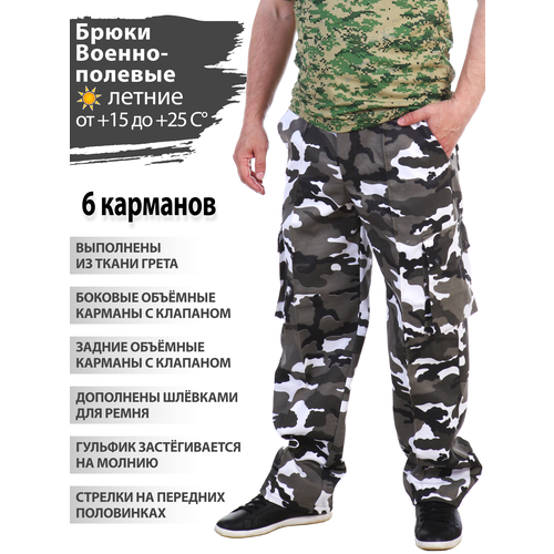 Брюки мужские военно-полевые камуфляжные летние с 6 карманами для охоты и рыбалки, для туризма, для походов в лес, для работы, для дома и дачи. Ткань - Грета. Брюки прямые на притачном поясе, на спинке собраны эластичной резинкой. На поясе имеются шлевки для широкого ремня. Изделие выполнено из прочной, современной ткани, с водоотталкивающей пропиткой. Брюки оснащены двумя карманами по бокам и двумя фигурными карманами с клапанами на липучках. Гульфик застегивается на молнии. Брюки можно использовать для туризма, походов, прогулок, охоты, рыбалки, пейнтбола, как спецодежду, брюки рабочие мужские, брюки для охоты и рыбалки, брюки для леса, рабочие брюки спецодежда, брюки для леса мужские, для дачи, как спецодежда, страйкбол, пейнтбол, милитари военные игры, прогулок, активный отдых, камуфлированная одежда, рыбацкий, повседневный, работа на стройке, одежда для охраны, спецодежда мужская, рыбацкий, камуфлированый, тактический.