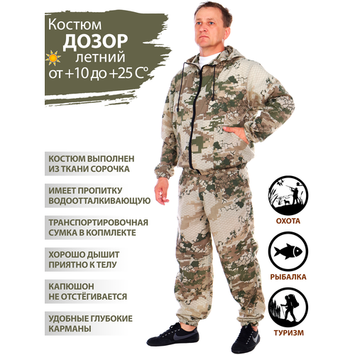 Костюм мужской камуфляжный легкий летний для охоты и рыбалки, а также для актвиного отдыха, для туризма и похода в лес. Куртка прямого силуэта, укороченная, с центральной застежкой - молнией, с поясом на резинке. Капюшон не отстегивается. Спинка с отрезной кокеткой, полочки цельнокроенные. Боковые накладные карманы втачаны в боковой шов. Рукава втачные двухшовные, с манжетами на резинке. Низ куртки с притачным поясам на резинке. Брюки свободного покроя с притачным поясом на резинке, с 2-мя боковыми накладными карманами. Вниз брюк вставлена резинка. Костюм рыболовный летний мужской. Для охоты, рыбалки, туризма, для дачи, как спецодежда, страйкбол, пейнтбол, милитари военные игры, прогулок, активный отдых, камуфлированная одежда, рыбацкий, повседневный, работа на стройке, одежда для охраны, спортивный, рыболовный, спец одежда мужская рабочая, для леса, за грибами, военный, для мужчин, женщин, подростков