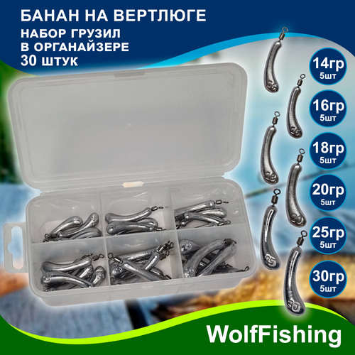Набор рыболовных грузил "Банан на вертлюге" 14, 16, 18, 20, 25, 30гр по 5шт (всего 30шт) в органайзере
