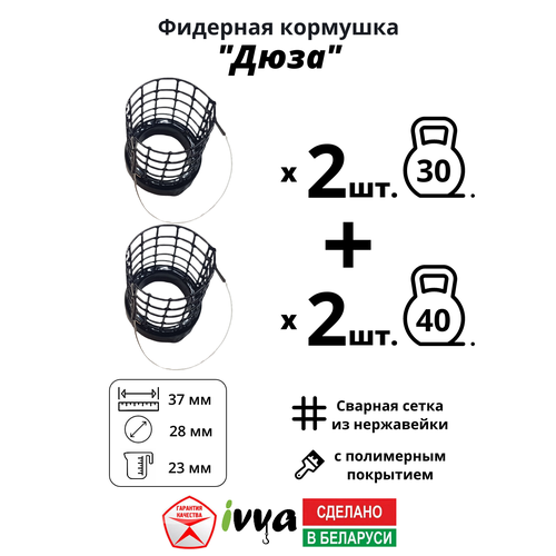 Кормушки фидерные IVVA "Дюза" - это набор из 4 штук, каждая из которых имеет свой вес: 30 г - 2 шт, 40 г- 2 шт.
