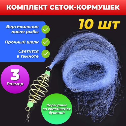Кормушку можно забрасывать как в ручную, так и с помощью спиннинга предварительно в кормушку-пружину нужно вдавить прикормку. Кормушка с сеткой при попадании В воду создает сетный объем, в котором кормится рыба выпадающим из кормушки кормом. Летом кормушку можно оснастить поплавком и забрасывать с берега, зимой в лунку. Пружинка с сеткой при ловле со льда опускается в лунку до дна, а затем приподнимается примерно на сантиметров 50 и в таком состоянии оставляется в ожидании, когда в неё попадётся рыба. Такая сетка с кормушкой предназначена и для ловли хищника, так как он охотится за рыбой, которая кормится возле кормушки. Бусина фосфорная светящаяся, Характеристики сетки: Ширина ячейки - 1,5х1,5см Максимальный вес рыбы - 0.30кг