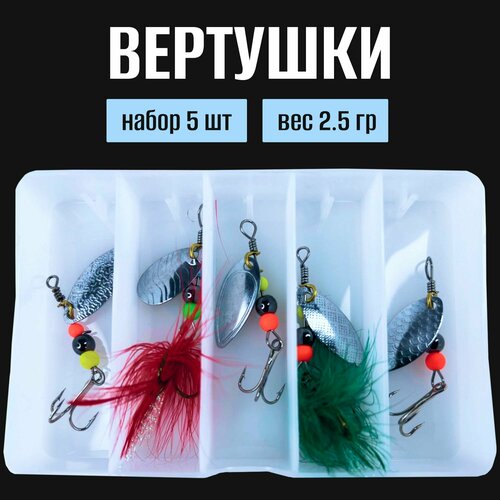 Набор блесен для рыбалки состоит из пяти штук на 2,5 грамма. Блесны упакованы в индивидуальную коробку из полупрозрачного пластика, разделенную на 5 прямоугольных ячеек.