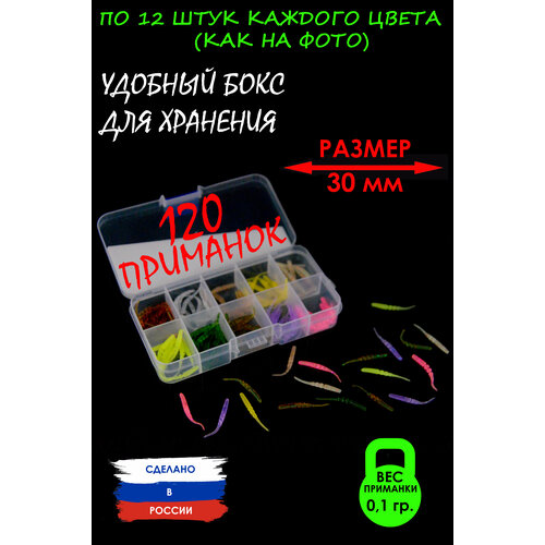 Отличный набор силиконовых приманок для рыбалки. Поставляется боксе, который можно брать с собой на рыбалку. Изготовлены из мягкого и звонкого силикона. Прекрасный подарок для рыбака, на любой праздник. В наборе приманка слаг 30мм в 10 цветах. Приманки можно использовать как на зимней рыбалке для мормышинга, так и летом для микроджига и наноджига. В набор входят уловистые цвета, которые подойдут для рыбалки в разное время года и в разное время суток. Исп.1. Красный, белый перламутр, машинное масло, чёрный, кола, pink LOX, лазурь, кислотный, шартрез, морковный. Исп. 2 бутылка, сирень, 2 оттенка болотного, 2 желтого, 2 машинного масла, барби, серебро. Цвета как на фото (однако может быть небольшой разнотон в зависимости от партии). По 12 шт каждого цвета, всего 120шт. Приманка для микроджига, приманка для наноджига. Мормышинг, наноджиг, микроджиг. Приманка на окуня, приманка на судака, приманка на щуку.