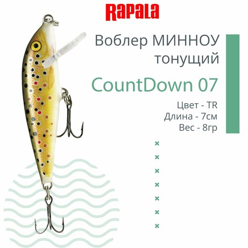 CountDown - тонущий воблер, в переводе, это обратный отсчёт. Совершив первый заброс, дайте приманке опуститься на дно, при этом производите отсчёт. Таким образом получаем число, на котором воблер достиг дна. Теперь погрузить приманку на нужную глубину очень легко. Достаточно сделать паузу, управляя погружением с помощью обратного отсчета. CountDown погружается со скоростью примерно 30 см за секунду. Таким образом вы можете осуществлять проводку на разных глубинах, рыбачить у самого дна или вести воблер над водорослями или другими подводными препятствиями. • Размер 7см. Вес 8гр. Рабочая глубина до 2,4м. • Тонущий воблер • Конструкция из бальсы • Органичные движения в воде • Техника контролируемой глубины • Большой размерный ряд • Крючки VMC чёрный никель • Ручная настройка и тестирование. • Цвет TR. • Минноу.