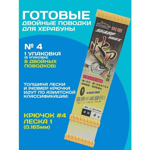 Собираетесь на рыбалку? Готовые поводки с двойными крючками будут незаменимыми аксессуарами для рыбалки. . Наборы поводков дляхерабуны под номерами #6, #7, #10, #11 - имеют безбородый крючок. Все остальные наборы включают в себя крючки с бородкой! Готовые карповые поводки с двумя крючками для ловли методом херабуна – идеальное решение на рыбалке Херабуна. Они позволяют быстро и оперативно оснастить снасть крючками или сменить поводки под нужные условия ловли. Крючки с бородкой изготовлены из качественной стали, надолго сохраняют идеальную остроту жала, устойчивы на разгиб. Жало крючка для херабуны – с изгибом в сторону. Крючки привязаны на одном отрезке лески 50 см, что позволяет выставить нужное расстояние между верхним и нижним крючком и завязать петельку для фиксации двойного поводка к оснастке херабуна. Применение двойных поводков заставляет играть приманку наживку, классика это когда в толще воды тесто для херабуны расмокает и "сыплется" с верхнего крючка на нижний - привлекая рыбу и провоцируя ее на атаку. В спортивных дисциплинах по ловле на Херабуну - даже есть условия, что в зачет идет рыба исключтельно пойманная на нижний крючок. А вот использование поводков для мирной рыбы несет совершенно иные задачи. Например, их наличие позволяет не допустить разрыва основной лески при превышении максимальной нагрузки. Также они способствуют лучшей подаче приманки. Очень удобная упаковка поводков в виде поводочницы в дальнейшем пригодится для самостоятельной вязки и хранения поводков.