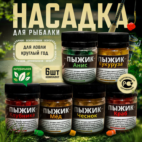 Рыболовная Насадка "Пыжик" 5мм /Рыболовный комплект Микс 6 штук/ Насадка на крючок/ для рыбалки/ Вкус: Клубника, Краб, Анис, Чеснок, Мёд, Кукуруза