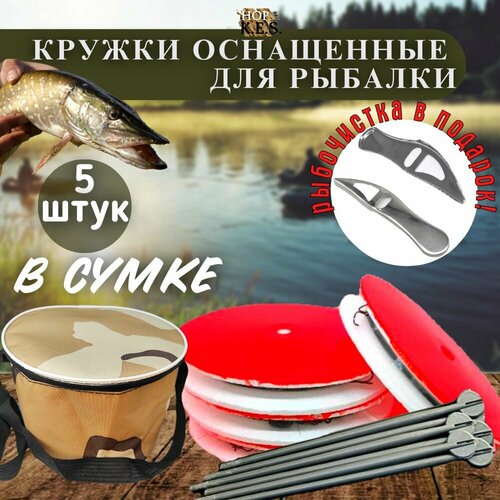 Оснащенные кружки для рыбалки на щуку 5шт в сумке + Рыбочистка в подарок! / Комплект летних жерлиц с оснасткой / Кружок рыболовный на хищника