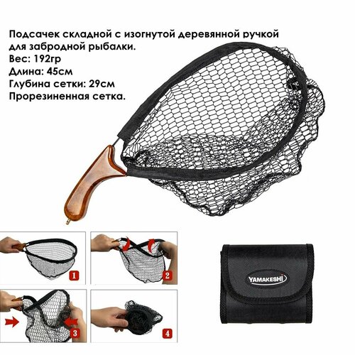 Подсачек Yamakeshi 45см складной с изогнутой ручкой в сумке для забродной рыбалки - brown