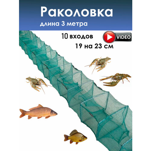 Раколовка верша рыболовная. Длина 3 метра. Размер каркаса 20 на 25 см. ячея 5мм. 10 входов. Китайская длинная раколовка выполнена из нейлоновой сетки и отлично подходит для ловли рыбы и раков. Главное преимущество раколовки в том, что рыба ловится сама - надо только лишь добавить прикормку во внутрь и опустить вершу под воду. Ловушка для раков практически не видна в воде, поэтому не будет спугивать добычу. По всей длине раколовки расположены конусные входы внутрь для затрудненного выхода улова из ловушки. Раколовки-гармошки можно легко сложить, придав им компактные размеры. Снасть изготовлена из прочного материала и может быть использована неоднократно. Имеет темно зеленый цвет, что позволяет ей слиться с подводной средой водоема. Длинная снасть имеет большое количество входов позволяет добычи легко попасть во внутрь с помощью запаха прикормки, а вот выйти ей уже невозможно. Сеть состоит из прочного полиамидного полотна. Размеры и точное описание смотрите на фото. Будет отличным подарком, для рыболова. Возьмите с собой на отдых на реке и порадуйте вкусным уловом себя и своих близких.