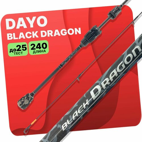 Спиннинг Dayo BLACK DRAGON - качественное бюджетное удилище которое подойдет как для начинающего рыбака, так и для опытного. Таким спиннингом уже можно ловить крупную рыбу. Достаточна и дальность заброса. С легкими приманками типа вертушек уже могут возникать проблемы в точности и дальности заброса. Данные спиннинги часто применяют для троллинга. Длина удилища составляет 240см, а вес 126г. Транспортировочная длина 120см, количество колен 2. Тест от 5-25г.