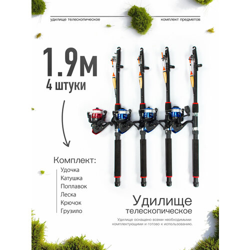 Удилище телескопическое в сборе (катушка + леска + поплавок + грузило) 1,9 метра, комплект 4 шт.
