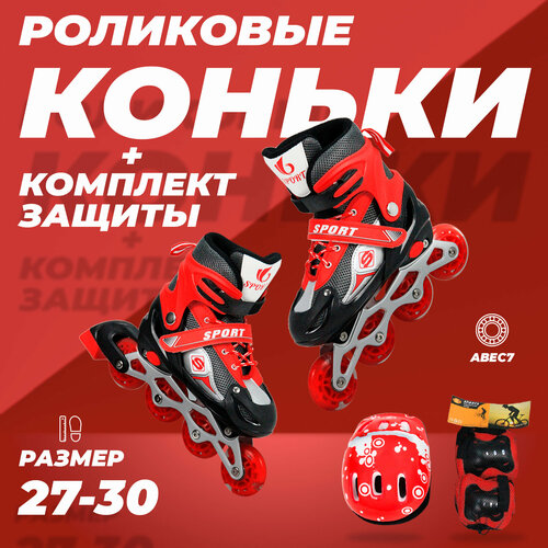 Роликовые коньки раздвижные 27-30, защитный набор в комплекте, ABEC7, красные