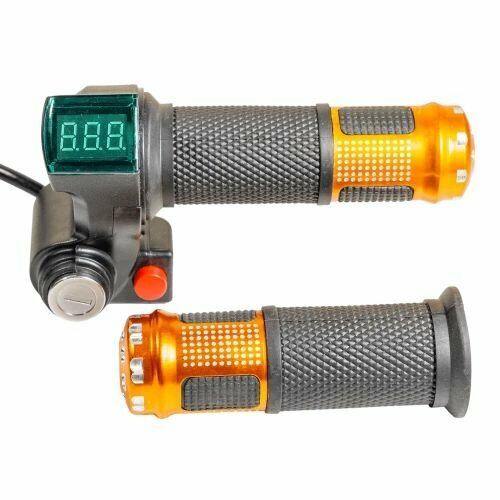 Ручка газа с вольтметром кнопкой и замком зажигания оранжевая ( кабель 1.7м ) для электровелосипедов, электросамокатов - это идеальный аксессуар для любителей активного образа жизни. Этот набор состоит из нескольких важных элементов, которые помогут вам контролировать работу вашего электровелосипеда или электросамоката.