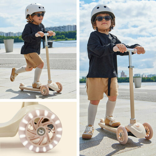 50035, Самокат Happy Baby TORNADO V2, со светящимися колесами, высота руля регулируется, со стикерами и корзиной, бежевый