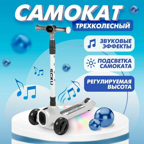 Детский трехколесный самокат, городской, для девочек и мальчиков, с подсветкой и музыкой, максимальная нагрузка 80 кг, бело-черный