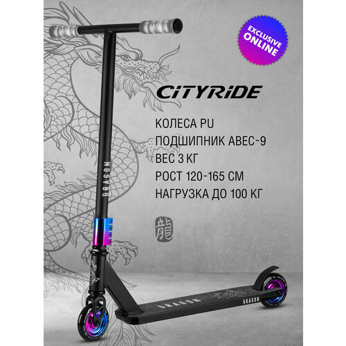 Самокат трюковый CITYRIDE DRAGON, двухколесный, детский/подростковый, колеса PU/100 мм, 4-х болтовый алюминиевым хомут, пластиковые диски, CR-SS-04GP