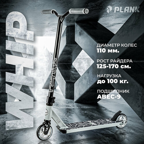 PLANK WHIP - Трюковый самокат для прогрессирующих райдеров, который поможет в обучении всей линейки трюков! Дека из алюминиевого сплава отвечают за надёжность и безопасность райдера. Колеса диаметром 110 мм и подшипники ABEC-9 обеспечат отличный накат и скорость. Размер деки: 505(Д) x 110 (Ш) x25( В) мм. Размер руля: 590 (В) х 555(Ш) мм. Колеса: 110X24MM PU Wheels 88A алюминиевый сердечник. Подшипники: ABEC-9. Высота руля от земли до ручек 83см. Макс. нагрузка: 100кг. Возраст:7+ PLANK – это бренд, созданный в 2019 году, который в данное время занимает лидирующие позиции в спортивной индустрии. Основное преимущество компании в том, что она является единственным, официальным дистрибьютором бренда PLANK на территории Российской Федерации.