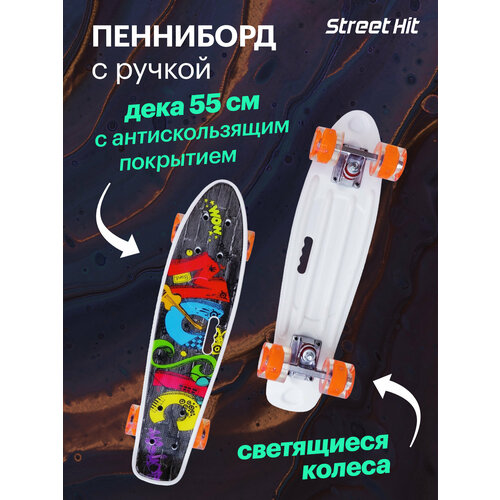 Яркий, маневренный и практичный – это все про пенни борд от бренда Street Hit. Идеальный скейтборд для езды по городу, выгодно отличающийся от других досок своим небольшим размером (22 дюйма, 55х15см) и весом (1,6 кг). Пениборд обладает удивительной формой с загнутым, как у рыбы, хвостом, и интересной окраской – он пользуется большой популярностью среди детей и взрослых во всем мире. Из-за своих малых габаритов пениборд очень удобно носить в рюкзаке или даже в руках, его можно взять с собой на долгую прогулку по городу. При этом скейт выдерживает нагрузку по весу до 100 кг, именно поэтому его можно приобрести как детский скейтборд и как взрослый скейтборд.