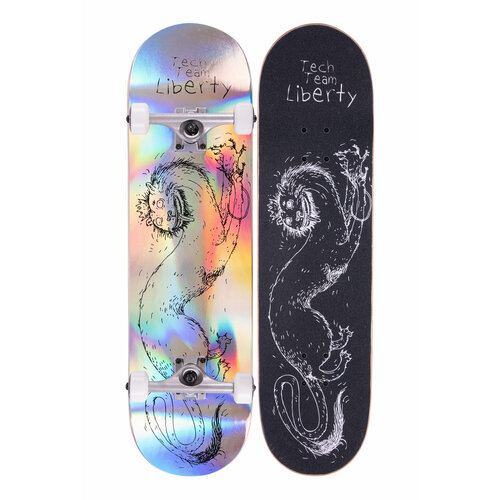 Прочный скейтборд TechTeam Liberty имеет стильный дизайн с рисунком в нижней части доски и повторяющимся рисунком на чёрной антискользящей шкурке на верхней части.