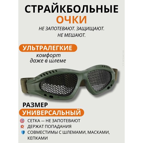 Лёгкие защитные очки с пластиковой сеткой вместо линз — не запотевают, не бликуют и обеспечивают вентиляцию при любых условиях. Отлично подходят для лёгкого страйкбола, туризма, работ на даче, велопрогулок, косплея, тренировок и outdoor-активностей. Обеспечивают базовую защиту глаз от ветра, пыли, сухих веток и слабых ударов.