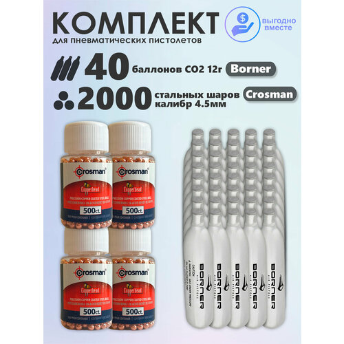 Баллончики CO2 40 шт Borner и шарики 2000 шт Crosman набор для пневматики, пневматического оружия