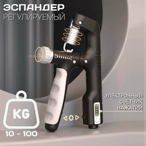 Кистевой регулируемый эспандер со счетчиком нажатий в диапазоне нагрузок от 10 до 100 кг с удобными не скользящими ручками.