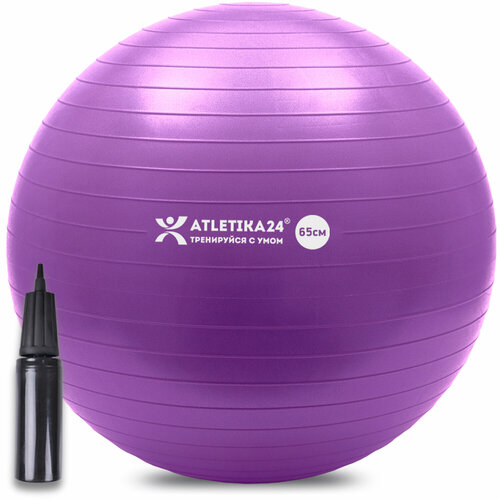 Фитбол с насосом гимнастический мяч Atletika24 для новорожденных детей и взрослых, антивзрыв, фиолетовый, диаметр 65 см