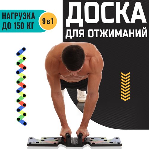 Доска имеет цветовую маркировку, которая помогает определить наиболее эффективные позы отжимания с несколькими комбинациями позиций, что позволяет проводить тренировки верхней части тела максимально эффективно. Упоры с платформой обеспечивают безопасность и простоту в использовании, а противоскользящие накладки на ручках обеспечивают надежный захват и равномерное распределение нагрузки, что уменьшает давление на суставы.