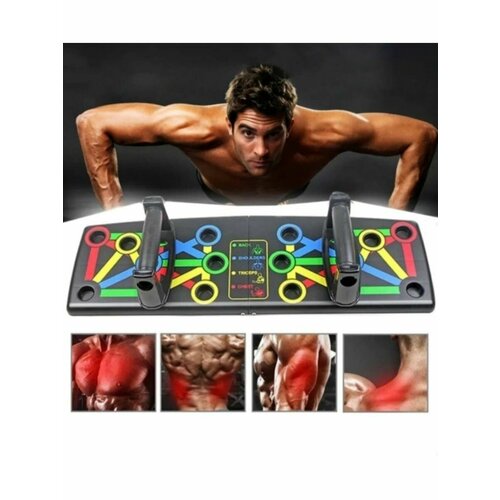 Тренажёр-платформа для отжиманий с регулируемыми упорами - это многофункциональный фитнес-тренажер, который представляет собой пластиковую доску с цветными маркерами и разными положениями ручек-упоров. Он предназначен для выполнения отжиманий от пола и имитации хвата, который используется на параллельных брусьях.