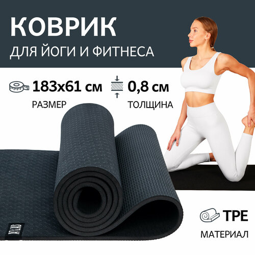 Коврик для фитнеса и йоги ATLAS TPE 8мм, 183х61 см черный, спортивный нескользящий коврик для тренировки, пилатеса и гимнастики