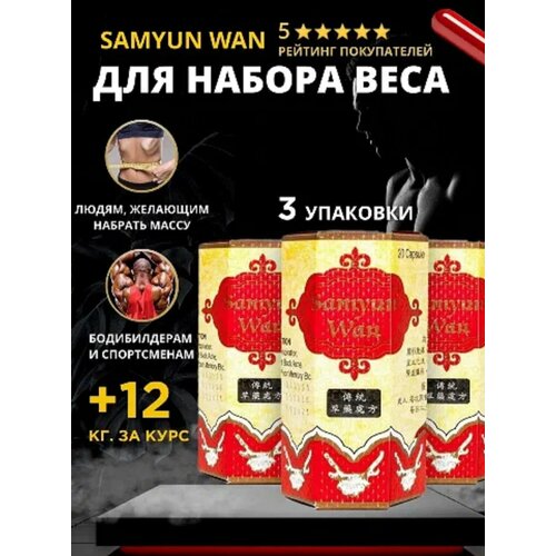 Занимаетесь спортом и необходимо набрать мышечную массу? Хотите поддержать иммунитет и наладить сон? Подбираете натуральные бады для нормализации обмена веществ и поднятия аппетита? Samyun Wan - натуральный препарат для набора веса. Эта пищевая добавка наполняет организм полезными веществами и безопасна для здоровья! Капсулы полностью состоят из природных компонентов и подходят для набора веса и мышечной массы. Бады с таким составом активно применяют для улучшения аппетита и сна, а также для восстановления организма. Они подходят и для мужчин, и для женщин. В составе добавки: корень шанданского женьшеня, японская айва, корень астрагала, экстракт рогов оленя и другие полезные ингредиенты. Собранные вместе, они положительно влияют на весь организм. Таблетки Самюн Ван идеальны для набора и коррекции веса. Бады подходят для спортсменов профуровня и любителей спорта в лайт - формате. Продукт улучшает циркуляции крови, укрепляет иммунную систему и увеличивает выносливость организма в целом.
