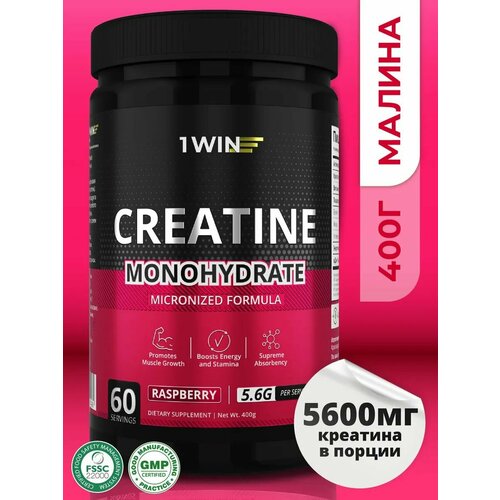 Креатин моногидрат порошок 1WIN, Creatine Monohydrate, Вкус Малина, 60 порций, спортивное питание для набора массы тела