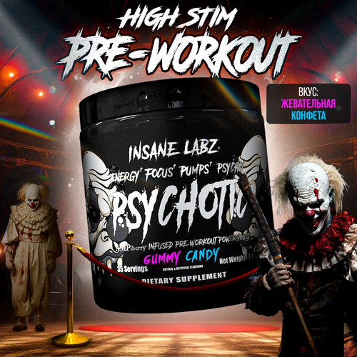 Psychotic Black от Insane Labz – пампинг + стимуляция ЦНС – высокоэффективный предтренировочный комплекс для атлетов любого уровня тренированности. 1 порция = 1 скуп усваивается спустя 15-30 минут после употребления и действует 2-2,5 часа. Эффект начинается плавно – без резкого подъема энергии (без обильного потоотделения) и так же плавно заканчивается – апатия и «вялость» после тренировки отсутствуют.