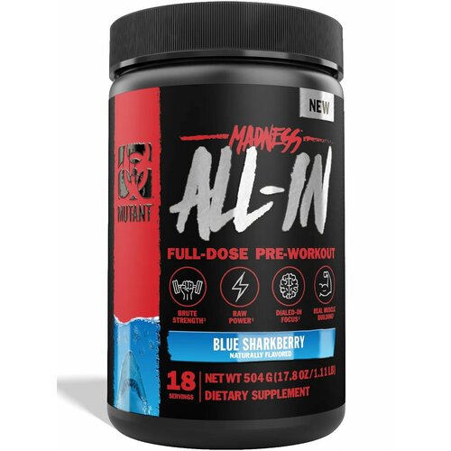 MUTANT MADNESS ALL-IN — это мощная предтренировочная программа для спортсменов, которые никогда не сдаются и не останавливаются, — тех, кто предпочитает ALL-IN, а не «все болтает». Спортсмены, которые живут на пределе и работают изо всех сил без компромиссов, знают, что вам нужно заправляться лучшим.